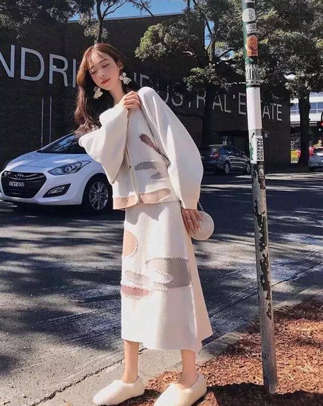 针织鞋很有秋冬的感觉,如果配上其他鞋很奇怪,配毛毛鞋就比较正常,而且针织裙看上去比较重,穿上轻便的毛毛鞋使整体搭配更协调,毛毛鞋最好选浅色系,会使整体搭配更可爱,更有小女人的感觉。
