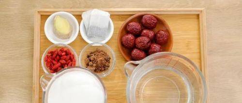 生姜:20g、红枣:8颗、红糖:20g、枸杞:20g、红茶包:2包、牛奶:500g、清水:约1500g