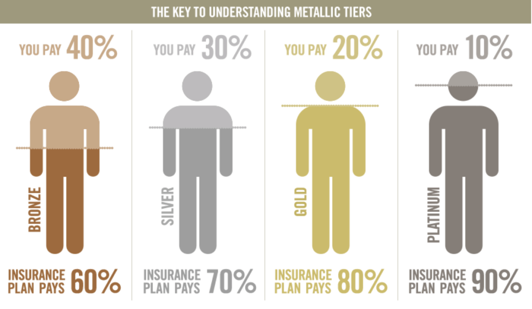 根据保险公司与消费者分担费用的比例而划分的不同级别的计划以金属的名称来命名,就是我们常听到的“铜计划”、“银计划”的由来。